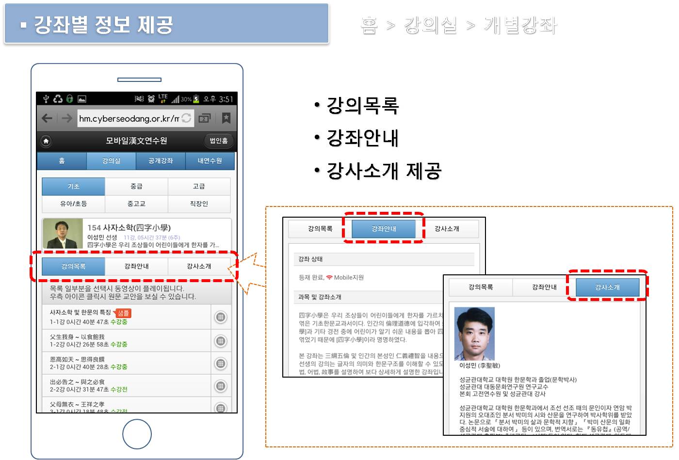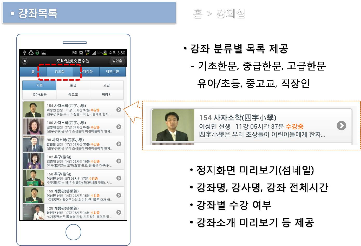 나. 섬네일, 강좌명, 강사명, 강좌 전체시간 등