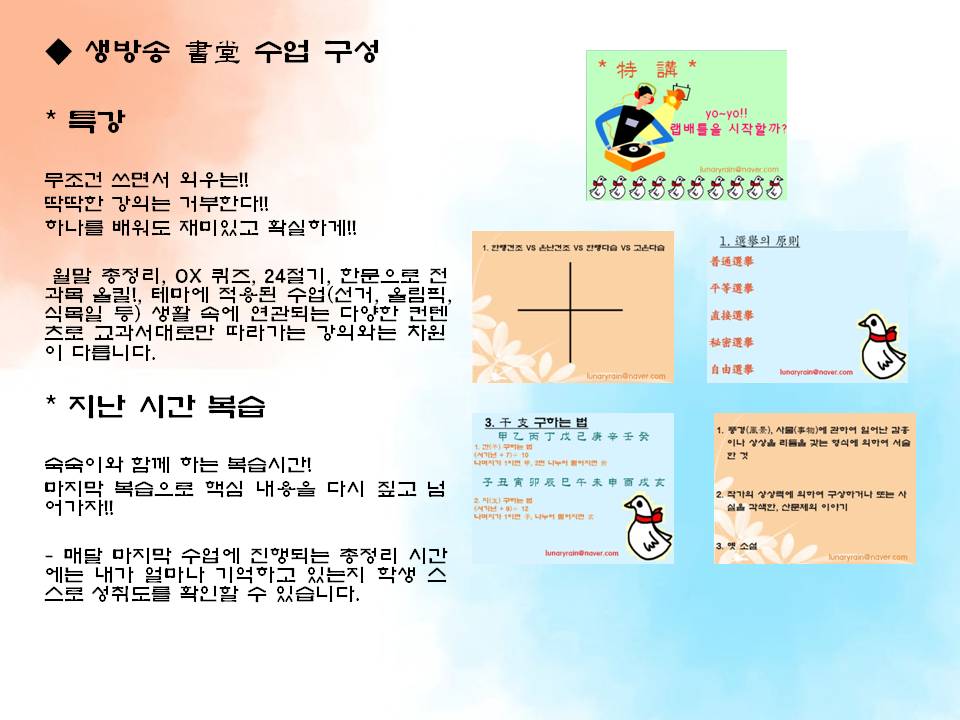 월말 총정리, OX 퀴즈, 24절기, 한문으로 전과목 올킬!, 테마에 적용된 수업(선거, 올림픽, 식목일 등) 생활 속에 연관되는 다양한 컨텐츠로 교과서대로만 따라가는 강의와는 차원이 다릅니다.